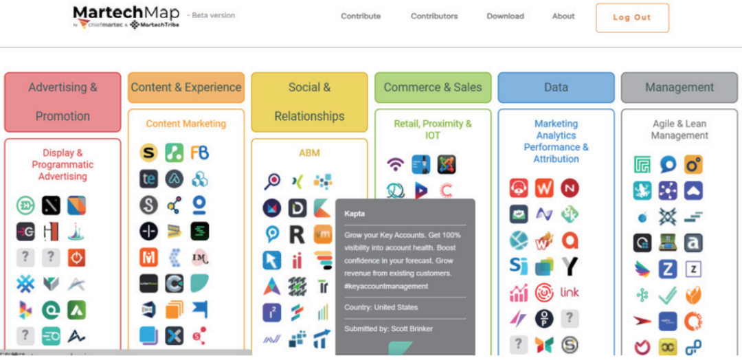 Martech是營銷(xiao)(xiao)技(ji)(ji)(ji)術的(de)(de)(de)簡稱(cheng),最早提(ti)出這(zhe)個(ge)概(gai)念的(de)(de)(de)是Scott Brinker。2011年(nian),Scott Brinker首次用制作營銷(xiao)(xiao)技(ji)(ji)(ji)術全景圖(tu)(tu)的(de)(de)(de)方式,定義、記錄和(he)梳理(li)行(xing)(xing)業(ye)中(zhong)為品牌提(ti)供(gong)(gong)Martech服(fu)務的(de)(de)(de)供(gong)(gong)應商(shang)和(he)它們所擅長的(de)(de)(de)服(fu)務領(ling)域。Martech可以(yi)理(li)解為技(ji)(ji)(ji)術對營銷(xiao)(xiao)全域和(he)全流程的(de)(de)(de)賦能(neng),營銷(xiao)(xiao)人員通過技(ji)(ji)(ji)術手段(duan)落實(shi)營銷(xiao)(xiao)業(ye)務的(de)(de)(de)執行(xing)(xing),借助(zhu)營銷(xiao)(xiao)工具進(jin)行(xing)(xing)自動(dong)或者(zhe)半自動(dong)的(de)(de)(de)操作,以(yi)完成數(shu)據洞察、創(chuang)意優化、傳播調控、銷(xiao)(xiao)售(shou)線索管理(li),客戶聯(lian)系、渠道分析等工作。根(gen)據Scott Brinker對Martech 從(cong)(cong)業(ye)機(ji)構(gou)行(xing)(xing)業(ye)版圖(tu)(tu)的(de)(de)(de)板塊(kuai)劃(hua)分,提(ti)供(gong)(gong)Martech服(fu)務的(de)(de)(de)服(fu)務商(shang)主(zhu)要(yao)包括(kuo)廣告與(yu)(yu)(yu)促(cu)銷(xiao)(xiao)、內容與(yu)(yu)(yu)體驗、社(she)交與(yu)(yu)(yu)關(guan)系、商(shang)務與(yu)(yu)(yu)銷(xiao)(xiao)售(shou)、數(shu)據、管理(li)這(zhe)六大模(mo)塊(kuai),并且每個(ge)模(mo)塊(kuai)之下,都擁(yong)有(you)數(shu)千家(jia)廠商(shang)。從(cong)(cong)這(zhe)六大功能(neng)模(mo)塊(kuai)可以(yi)看出,Martech范疇涵蓋了從(cong)(cong)廣告傳播到銷(xiao)(xiao)售(shou)達成的(de)(de)(de)閉環(huan),強調貫穿于商(shang)品與(yu)(yu)(yu)消費(fei)者(zhe)關(guan)系的(de)(de)(de)構(gou)建的(de)(de)(de)全流程。