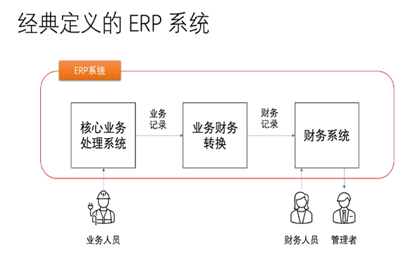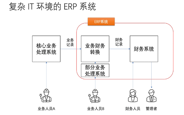 然而有些(xie)企(qi)業(ye)(ye)(ye)(ye)(ye)的(de)(de)業(ye)(ye)(ye)(ye)(ye)務(wu)(wu)環節比較復雜,標準的(de)(de) ERP 軟件無法處(chu)理(li)業(ye)(ye)(ye)(ye)(ye)務(wu)(wu)操作中的(de)(de)細節,例(li)如(ru)物流公(gong)司里的(de)(de)運(yun)單、運(yun)輸、倉(cang)儲(chu)、開賬等(deng)都有專(zhuan)業(ye)(ye)(ye)(ye)(ye)系(xi)統,金融機構的(de)(de)帳(zhang)戶、資金、客戶、契約等(deng)都有專(zhuan)業(ye)(ye)(ye)(ye)(ye)系(xi)統,制造業(ye)(ye)(ye)(ye)(ye)的(de)(de)排產、工藝、車(che)間(jian)等(deng)都有專(zhuan)業(ye)(ye)(ye)(ye)(ye)系(xi)統,電商公(gong)司的(de)(de)訂(ding)單、商品、物流等(deng)都由專(zhuan)業(ye)(ye)(ye)(ye)(ye)系(xi)統,業(ye)(ye)(ye)(ye)(ye)務(wu)(wu)人員不(bu)是在 ERP 系(xi)統中操作業(ye)(ye)(ye)(ye)(ye)務(wu)(wu),而是在專(zhuan)業(ye)(ye)(ye)(ye)(ye)系(xi)統中操作業(ye)(ye)(ye)(ye)(ye)務(wu)(wu),待業(ye)(ye)(ye)(ye)(ye)務(wu)(wu)活動完成后(hou),需要記賬的(de)(de)業(ye)(ye)(ye)(ye)(ye)務(wu)(wu)記錄傳到(dao)(dao)“業(ye)(ye)(ye)(ye)(ye)務(wu)(wu)財(cai)務(wu)(wu)轉換”機制里,再傳到(dao)(dao)財(cai)務(wu)(wu)系(xi)統,則后(hou)端系(xi)統叫 ERP 系(xi)統;有些(xie)套(tao)裝ERP軟件中能(neng)夠(gou)處(chu)理(li),而無須(xu)專(zhuan)業(ye)(ye)(ye)(ye)(ye)系(xi)統處(chu)理(li)的(de)(de)標準化業(ye)(ye)(ye)(ye)(ye)務(wu)(wu),例(li)如(ru)采購、庫存(cun)等(deng),可以(yi)仍(reng)然保留在 ERP 系(xi)統里,由這部分職能(neng)的(de)(de)業(ye)(ye)(ye)(ye)(ye)務(wu)(wu)人員直接操作 ERP。