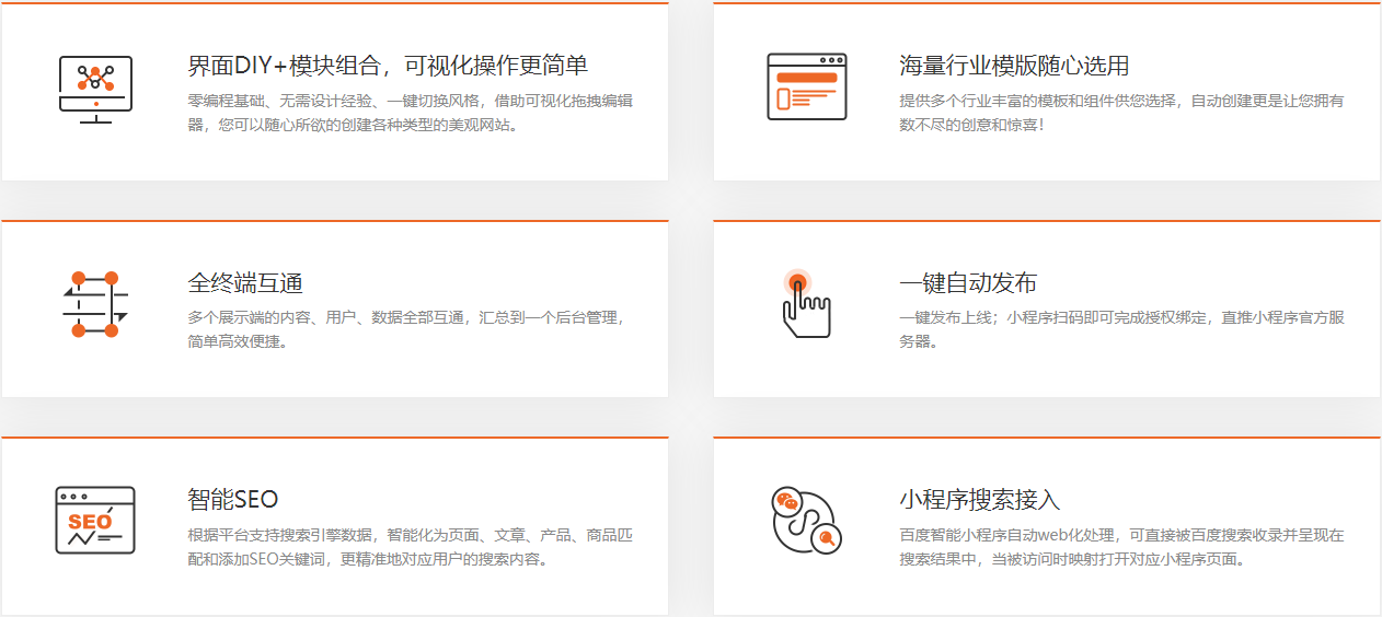 零代碼基礎即可操作,可視化的拖拽(zhuai)方式,海量的行業(ye)模板,助(zhu)力企業(ye)輕(qing)松打造(zao)六合一小程(cheng)序(xu)站點